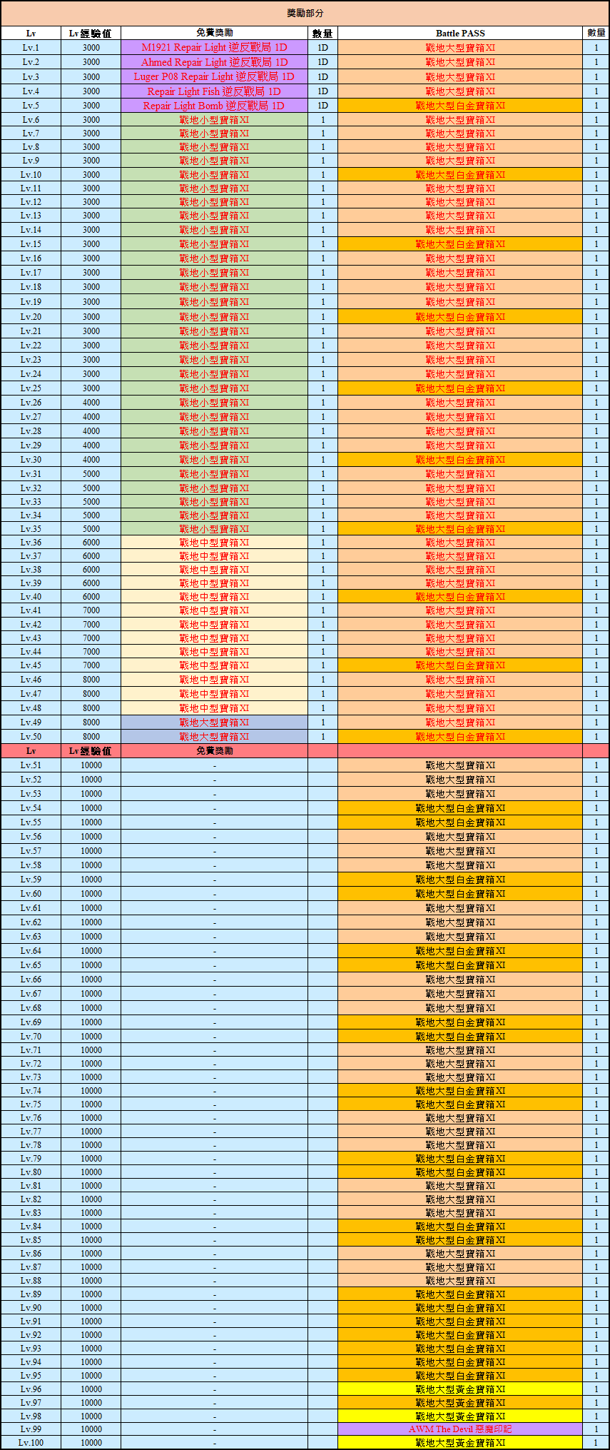 ●Lv100獎勵每日限定可領取 10 次,每次需達成累積 L99升級至 L100 的 戰地經驗值 乙次 ,每次累積達成後需領取當次的獎勵才會歸 0 重新開始累計下次領取所需的戰地經驗值( L99升級至 L100 的 戰地經驗值),若因未領取導致無法重新累計,造成領取的損失一律不予補發。