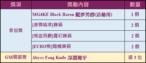 3. 活動結束後,GM將會從參與活動的玩家中挑選出3位寫的最優秀的玩家,贈送[Abyss Fang Knife 深淵獠牙]。