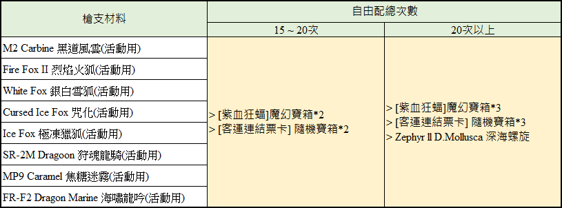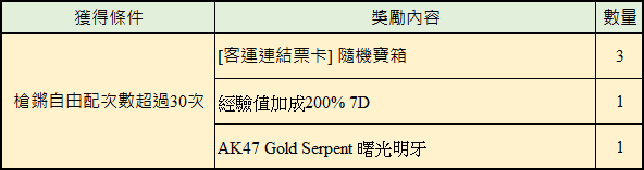 活動期間內至[快速配對]頻道遊玩[狙擊-士林夜市],達指定遊玩場次,即可獲得以下對應區間獎勵。