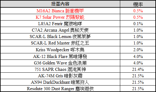 ※ 抽中「M16A2 Bianca 脈衝機甲」即可額外獲得 【Skorpion Bianca 脈衝機甲】(每個帳號限領一次)。