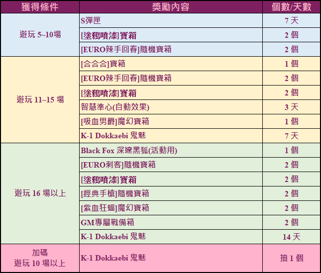 活動期間內至[快速配對]頻道遊玩[感染逃脫],達指定遊玩場次,即可獲得以下對應區間獎勵。