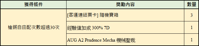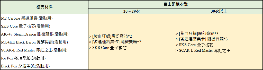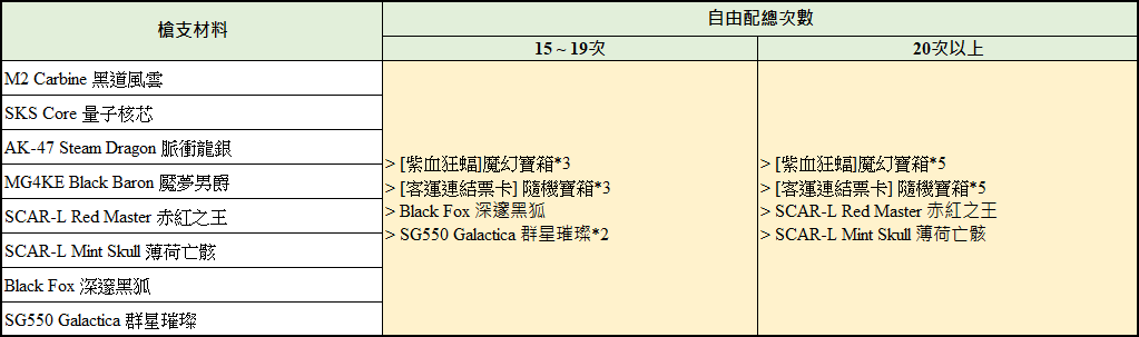1.使用指定槍枝材料進行槍鏘自由配達30次。