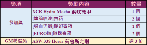 3. 活動結束後,GM 將從所有參與者中評選出 3 位攻略最優秀 的玩家,贈送[ASW.338 Horus 荷魯斯之眼]。