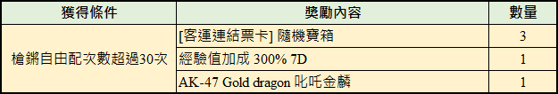 在活動期間內,使用合成槍枝材料進行「槍鏘自由配」,達成 30 次 以上,即可獲得活動獎勵!