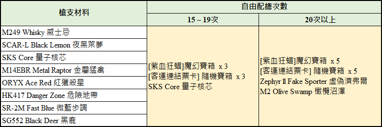 在活動期間內,使用「指定槍枝」作為右側材料進行「槍鏘自由配」,達成指定次數即可獲得專屬獎勵!