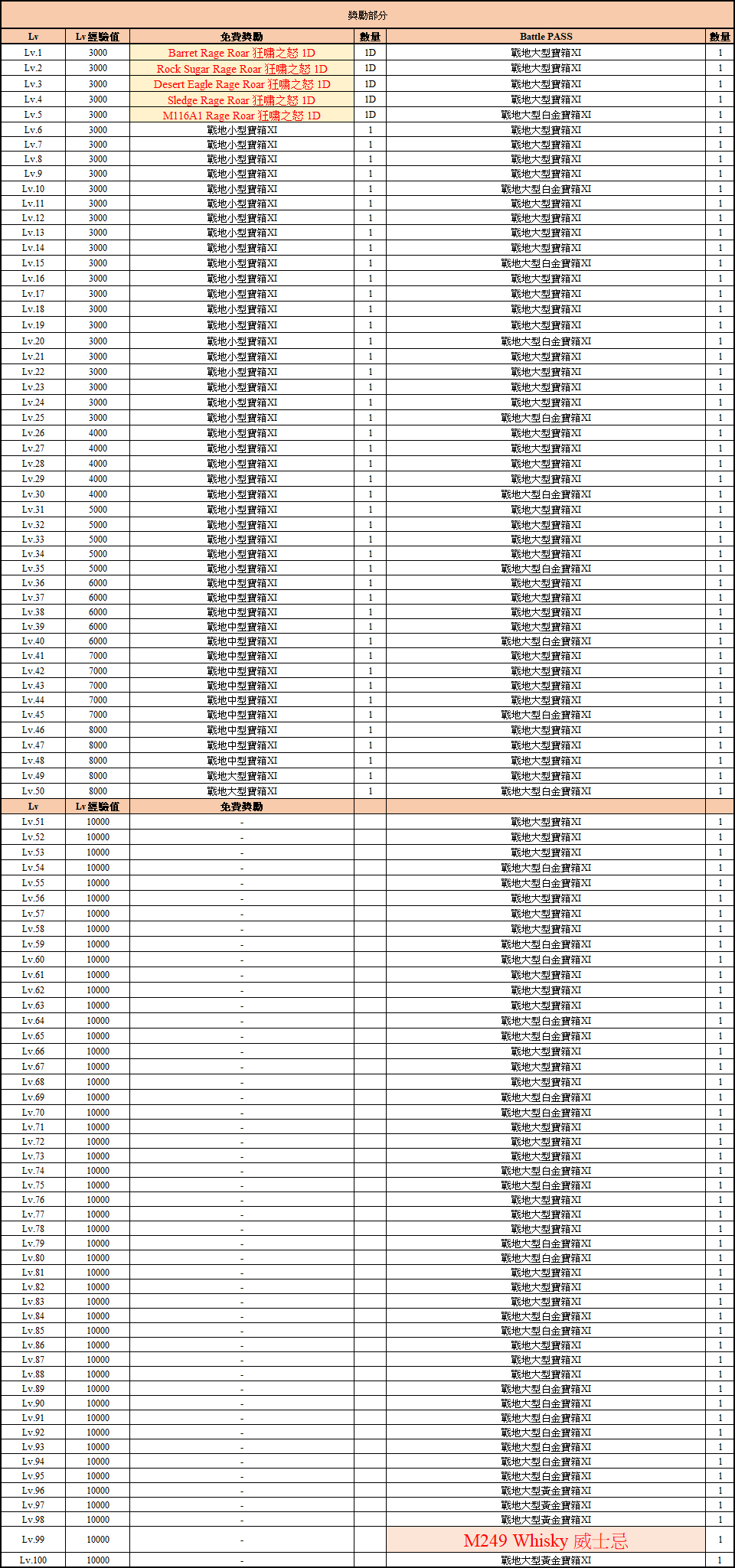 ●Lv100獎勵每日限定可領取 10 次,每次需達成累積 L99升級至 L100 的 戰地經驗值 乙次 ,每次累積達成後需領取當次的獎勵才會歸 0 重新開始累計下次領取所需的戰地經驗值( L99升級至 L100 的 戰地經驗值),若因未領取導致無法重新累計,造成領取的損失一律不予補發。