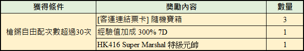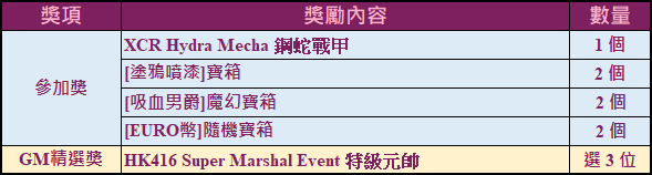 3. 活動結束後,GM 將從所有參與者中評選出 3 位攻略最優秀 的玩家,贈送[HK416 Super Marshal Event 特級元帥]。