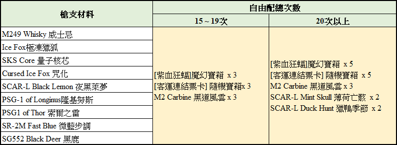 在活動期間內,使用「指定槍枝」作為右側材料進行「槍鏘自由配」,達成指定次數即可獲得專屬獎勵!