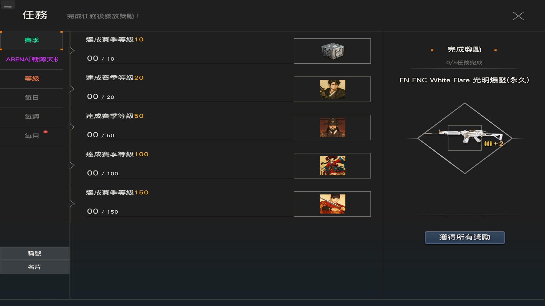- 完成所有賽季任務,可以獲得 FN FNC White Flare 光明爆發