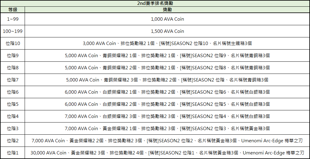 - 2nd賽季結束後,將根據達到的等級和排名發放以下獎勵