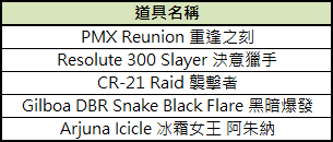 ◆ 序號內容:旗袍特務 阿珠娜 7天、包子砰砰彈 7天、M1 Accord Type.S 和諧典範S 7天、K-14 Siege 圍攻者 7天、AUG-A1 BWT 天降甘霖 7天