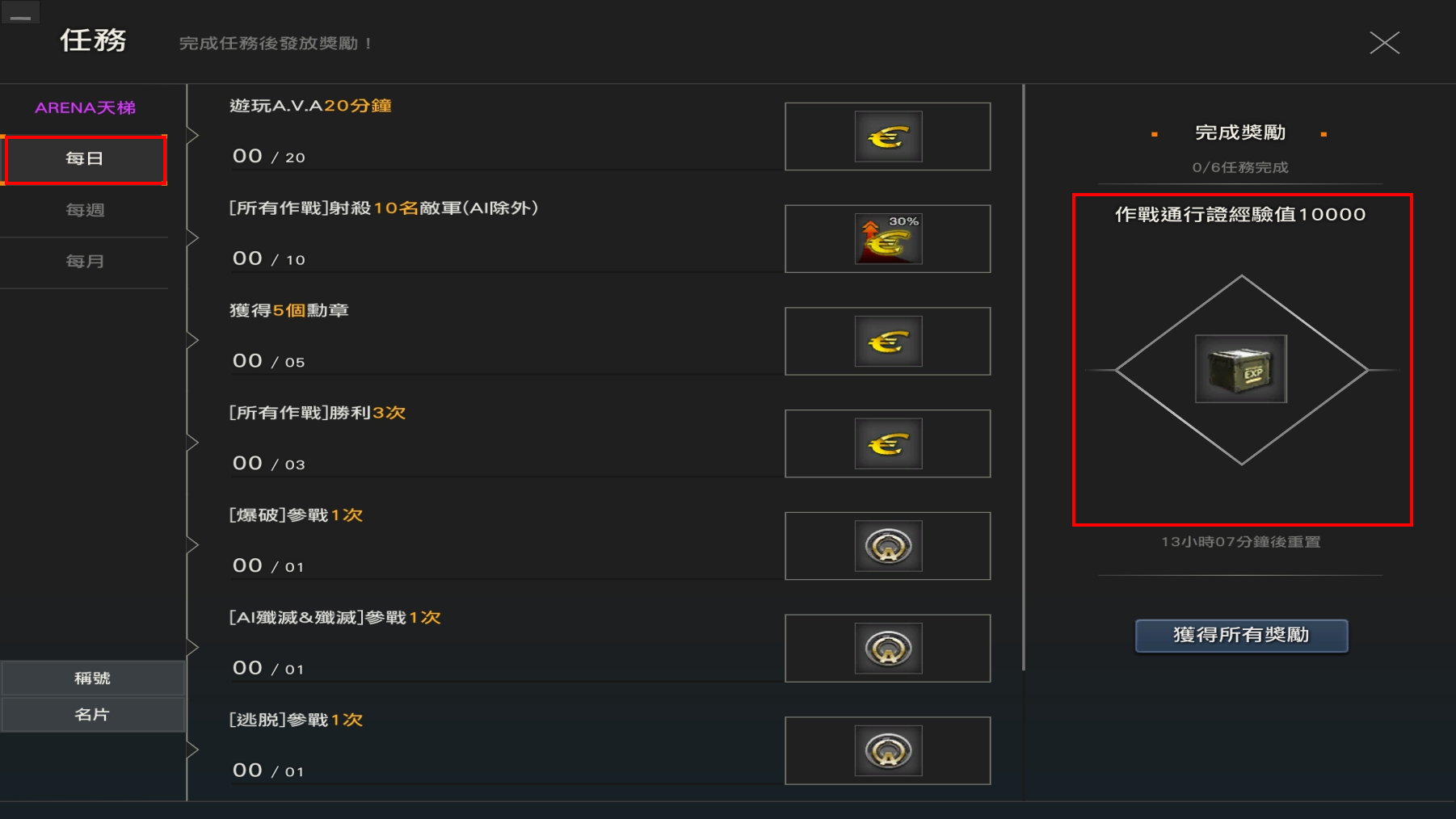 ※每日任務所獲得的【作戰通行證經驗】為作戰通行證系統專用經驗值,並不適用於現有角色等級經驗